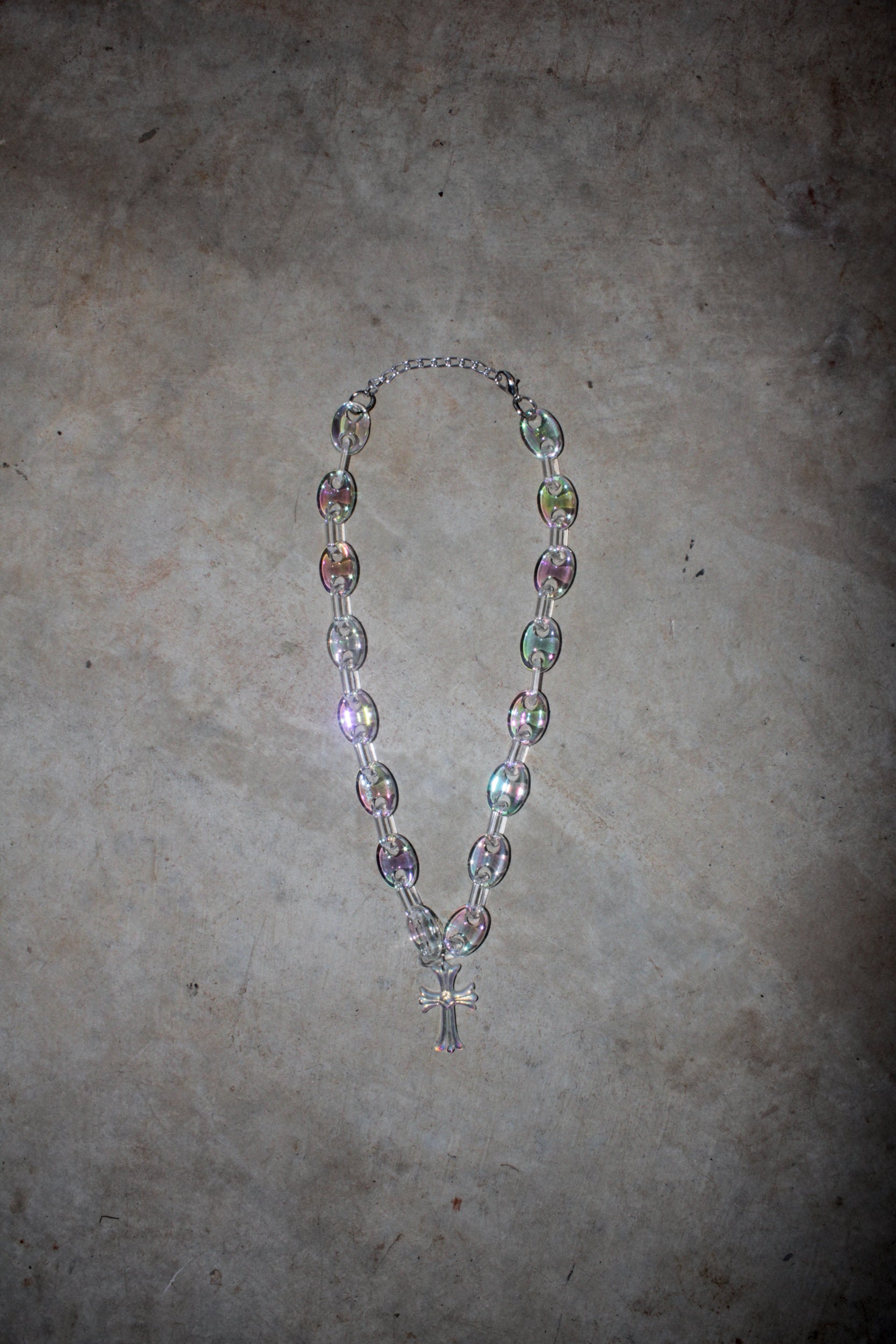 The necklace features uniquely designed acrylic links that capture light and reflect a mesmerising laser effect, adding a dynamic and multidimensional allure to your look. Another feature of this necklace is its adjustable length, offering versatility to suit any outfit or occasion.